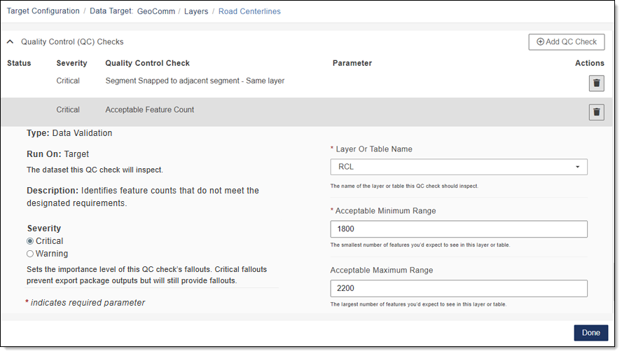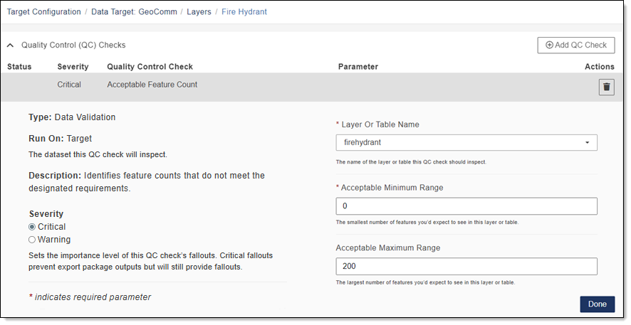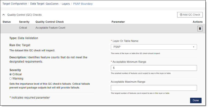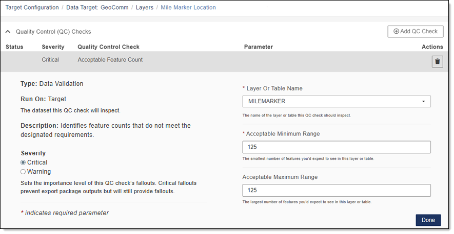 - Severity: Sets the importance level of this QC check’s fallouts. Critical fallouts prevent export package outputs but will still provide fallouts.