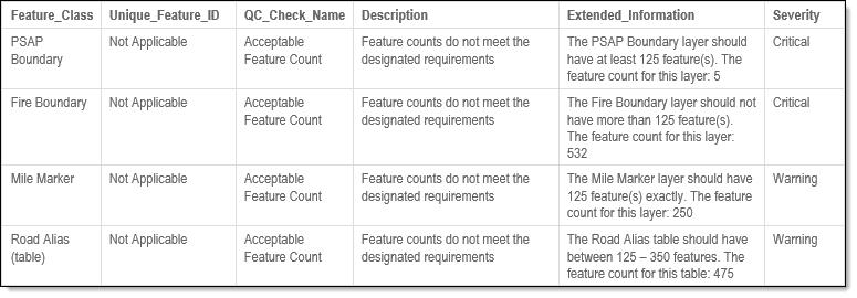 Unable to Determine Record Count: If the Acceptable Feature Count QC check is unable to determine the record count of a feature class or table, a fallout is created. The extended information in the Fallout report states, "The feature counts could not be calculated. Please confirm the validity of this data and try again."
