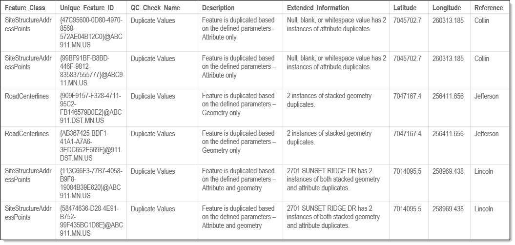 The Duplicate Values quality control (QC Quality Control) check identifies instances where data records appear multiple times within a dataset. The check identifies duplicates by examining attributes, geometry, or both. Geometry duplicates must be identical, while attribute Nonspatial information about a geographic feature in a GIS, usually stored in a table and linked to the feature by a unique identifier. For example, attributes of a river might include its name, length, and sediment load at a gauging station. duplicates are detected by matching values within features in the same layer. Additionally, Duplicate Values treats null values, blank spaces, and whitespace-only values as identical.
