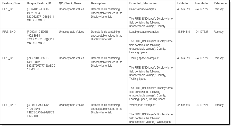 The example below shows possible error messages you may receive when a record fails the Unacceptable Values QC check. The extended information provides the layer/table name and the layer's field/column name where the unacceptable value was located along with the value that was triggered the fallout.