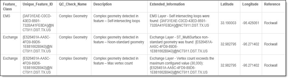 The Complex Geometry quality control (QC Quality Control) check identifies records in which the geometry's properties are outside of the normal acceptable geometrical attributes for most public safety applications.