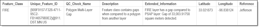 The example below shows possible error messages you may receive when a record fails the Polygon - Multi-Layer Gap check. The extended information provides the base layer name, the layer it was compared to, and the size of the gap detected in either square meters or feet. The unique feature ID displays the ID’s of the polygons surrounding the gap, helping to pinpoint the gap referenced by the fallout