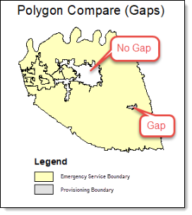 In this example, the sections marked as Gaps are gaps because the Emergency Service Boundary does not cover the Authoritative Boundary. The space labeled No Gap is not a gap because the Authoritative Boundary does not cover that space.