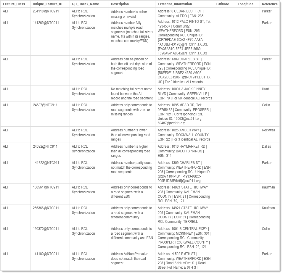 For information on using exception codes see Exception Code Basics or to view a list of subchecks completed when running the ALI to RCL Synchronization QC check and any exception codes for each subcheck, see ALI to RCL Synchronization Subchecks.