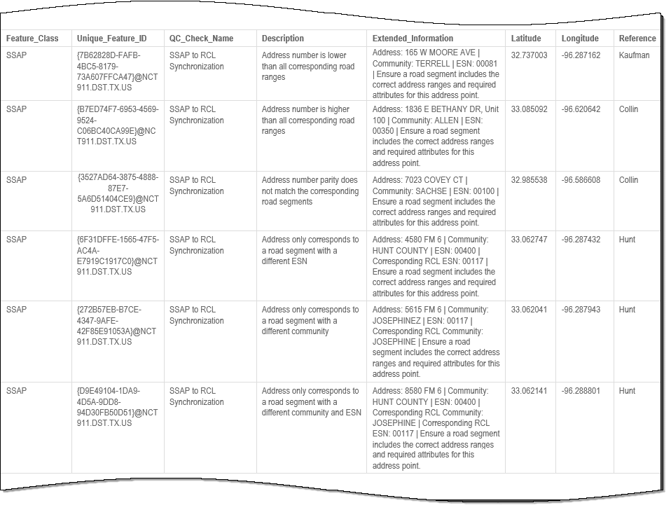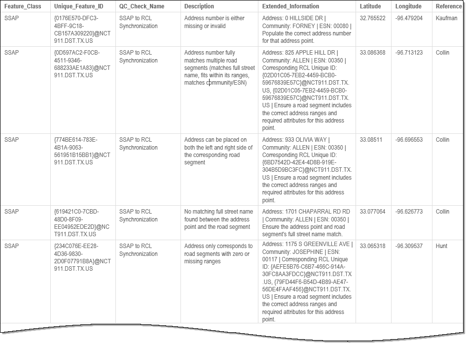 The SSAP Site Structure Address Point to RCL Road Centerline Synchronization quality control (QC Quality Control) check identifies where the Site/Structure Address Point (SSAP) address data is inconsistent with Road Centerline (RCL) data. This ensures that every address in the SSAP layer can be properly placed onto a corresponding road segment in the RCL layer.