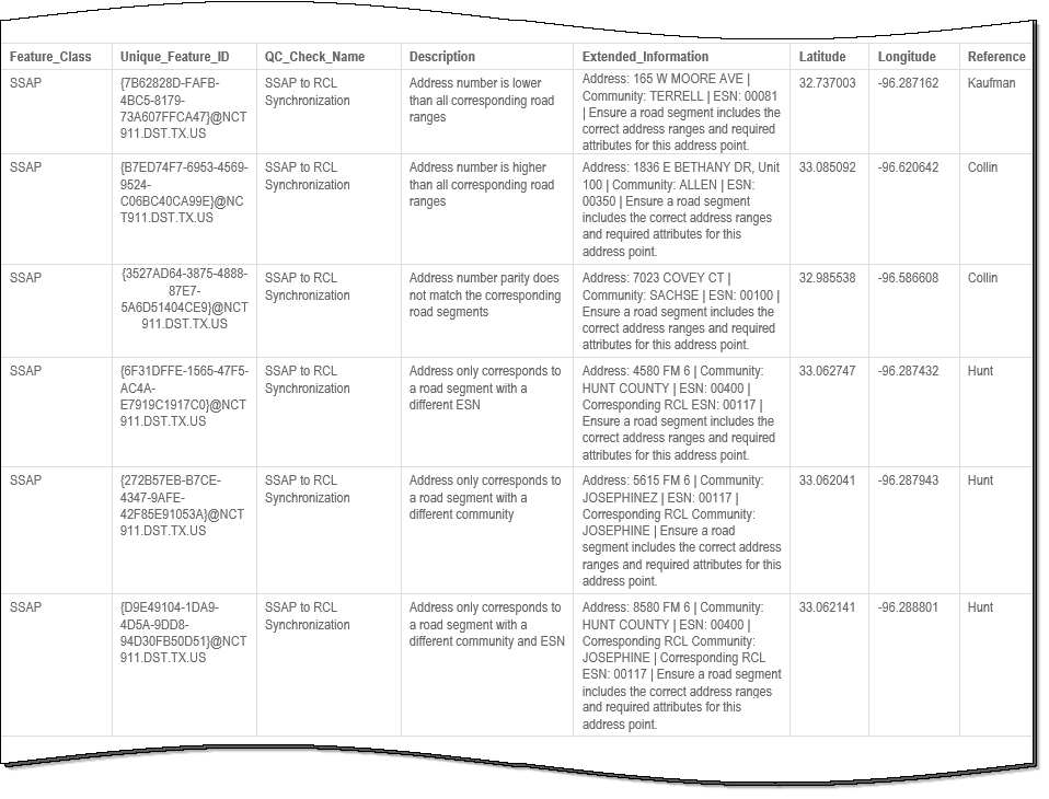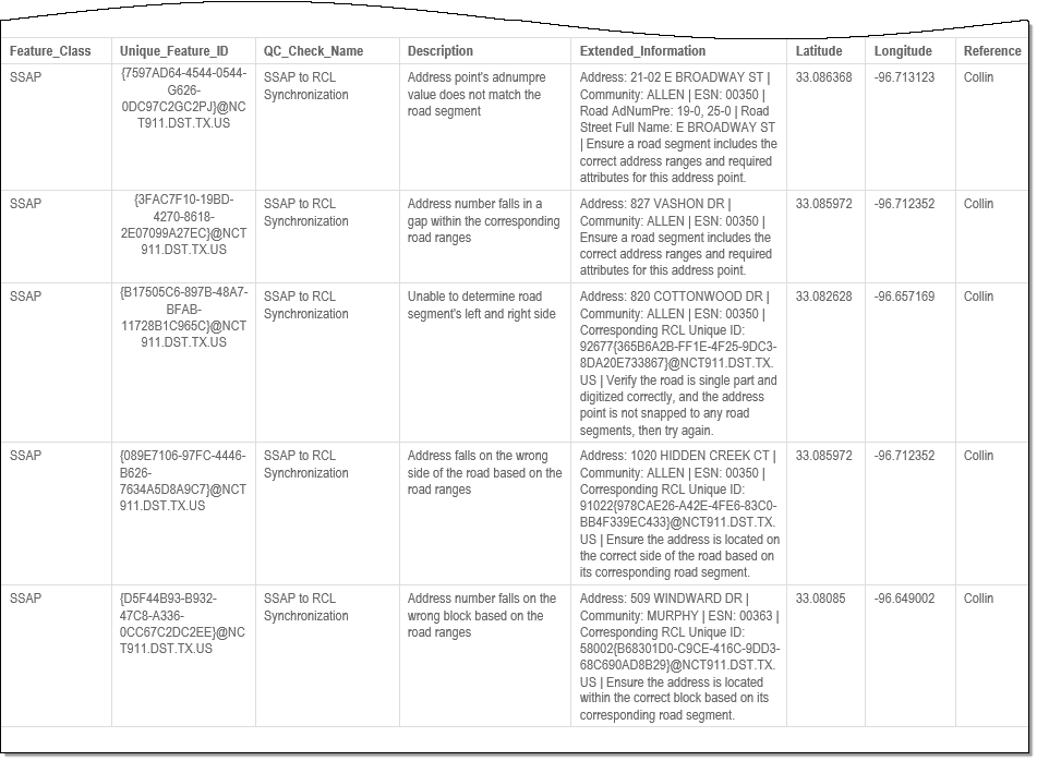 The examples below shows possible error messages you may receive when a record fails the SSAP to RCL Synchronization QC check. The extended information provides the detected and expected results when verifying that addresses in the SSAP can be properly placed onto a corresponding road segment in the RCL layer.