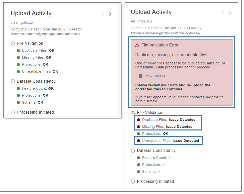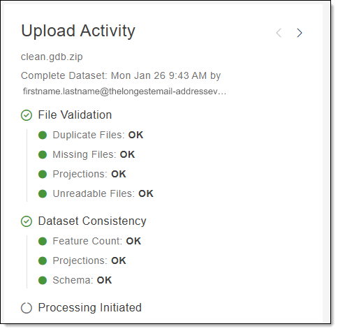 File Validation: When an upload is received, the data must be inspected to ensure no readability issues exist before processing can start. File Validation checks confirm the upload contains all the information necessary to process your job. Checks validate that feature classes have associated projections, scan for corrupt files, duplicated file names, and missing files. The file validation indicators alert you if any portion(s) do not pass.