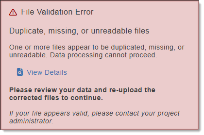 The File Validation Errors box is shown when the upload needs to be reviewed due to errors found when verifying the dataset. If available, a link is provided to view the errors that were located. File Validation Errors include the following: