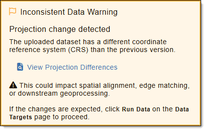 When this warning is shown, upload a new dataset if this change is unexpected or accept the change by manually starting your job(s). To run your job(s), see Enable and Run Data Targets.