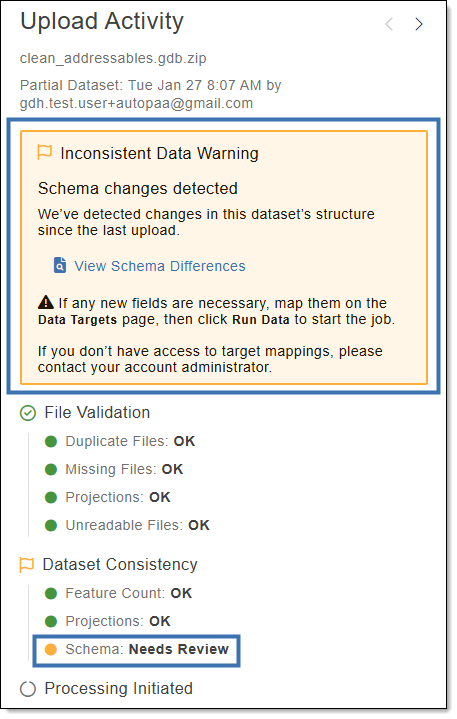 Data Consistency: File validation passed; however, changes were found that require your attention. Review the Upload Activity pane for further details and either upload a new dataset if the changes were not intentional, or manually start your job to approve the changes. Processing Initiated: Any job fails to start automatically. Manual steps are required to start the job. Refer to the Upload Activity Pane for further details. |