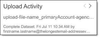 When a complete or partial dataset is submitted, the top of the Upload Activity pane updates automatically with the upload summary. The Upload Activity pane provides a visual resource to view real-time status. It provides feedback throughout the upload process to inform you if your upload will start your job automatically or if manual steps are required. Once populated, the Upload Activity pane displays the last 4 uploads for an agency.
