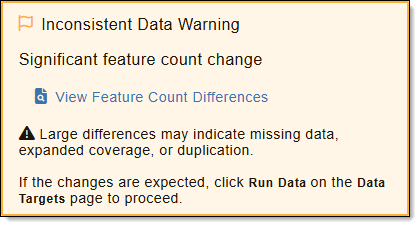 The Inconsistent Data Warning box is shown when the upload needs to be reviewed. If available, a link is provided to view the identified differences when verifying the upload. Inconsistent Data Warnings include the following:
