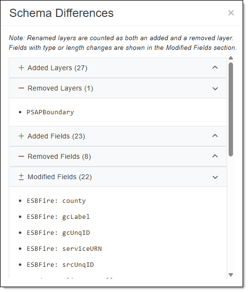 View Schema Differences: Schema differences include changes located in the dataset's structure since the last upload. When the link is clicked, a dialog box opens providing a list of schema differences that include: added and removed layers, added and removed fields, and modified fields.