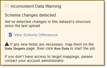 When this warning is shown, upload a new dataset if this change is unexpected or accept the change by manually starting your job(s). To manually run your job(s), see Enable and Run Data Targets.